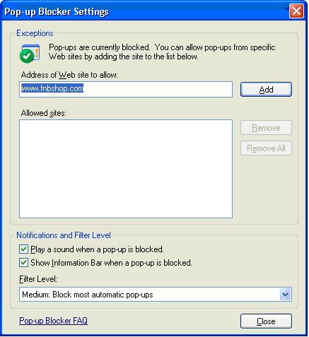Type "www.fnbshop.com" into the "Address of Web site to allow:" field then hit the "Add" button to move the domain into the "Allowed Sites" list