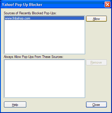 In the "Sources of Recently Blocked Pop-Ups" window, click on "www.fnbshop.com" then click the "Allow" button. The domain will be moved into the "Always Allow Pop-Ups From These Sources" window.